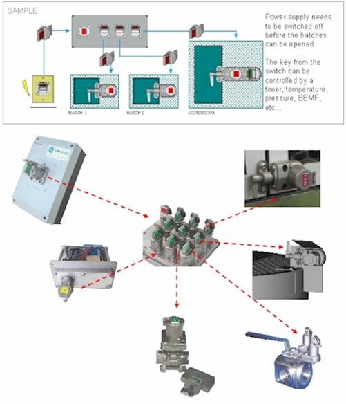 機(jī)械設(shè)備的安全防護(hù)和閥門連鎖類似,也是一個鑰匙管理系統(tǒng)。很多情況下工作間的門和電源開關(guān)需要被加入到鎖定的序列。
